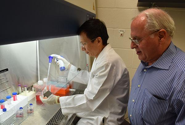 image: Fighting colorectal cancer at UTHealth are Lenard Lichtenberger, Ph.D., (right) and Dexing Fang, Ph.D.