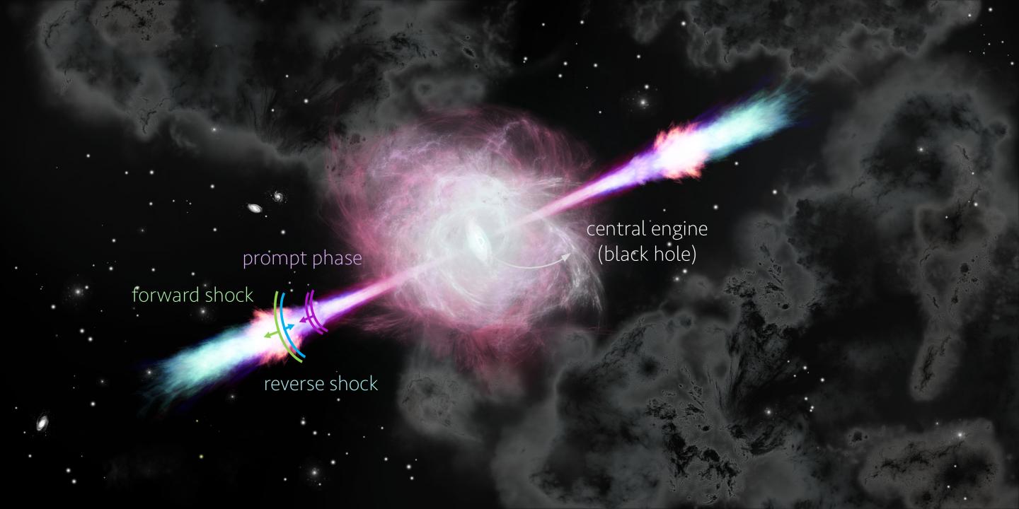 image: Impression of a GRB outflow showing the prompt phase (gamma-ray flash), reverse shock and forward shock.