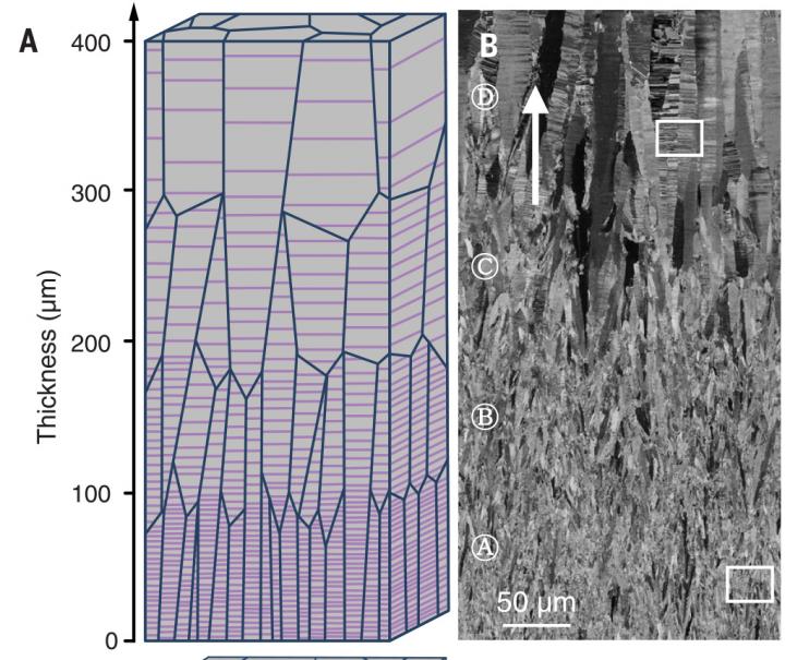 Gao and his colleagues created copper samples using four distinct components, each with different nanotwin boundary spacing. Spacings ranging from 29 nanometers between boundaries to 72 nanometers. The copper samples were comprised of different combinations of the four components arranged in different orders across the thickness of the sample. The researchers then tested the strength of each composite sample, as well as the strength of each of the four components.