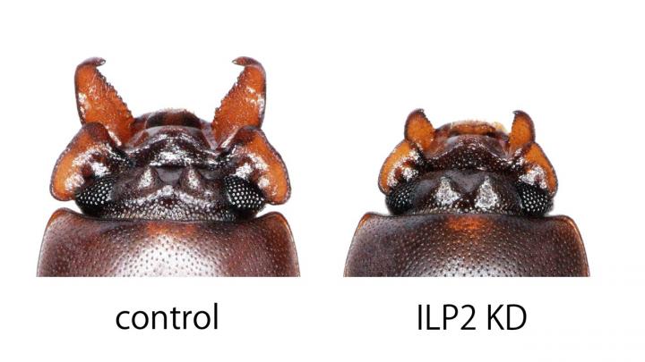 Tokyo, Japan - A scientist from Tokyo Metropolitan University and coworkers have discovered that a specific insulin-like peptide called ILP2 regulates the size of "weapons" in Gnatocerus cornutus beetles in different nutritional environments. They found diminished mandible size when expression of the peptide was suppressed, and that it was specifically expressed in the "fat body", where beetles store nutrients. This has important implications for understanding how striking growth occurs in different environments for different organisms.