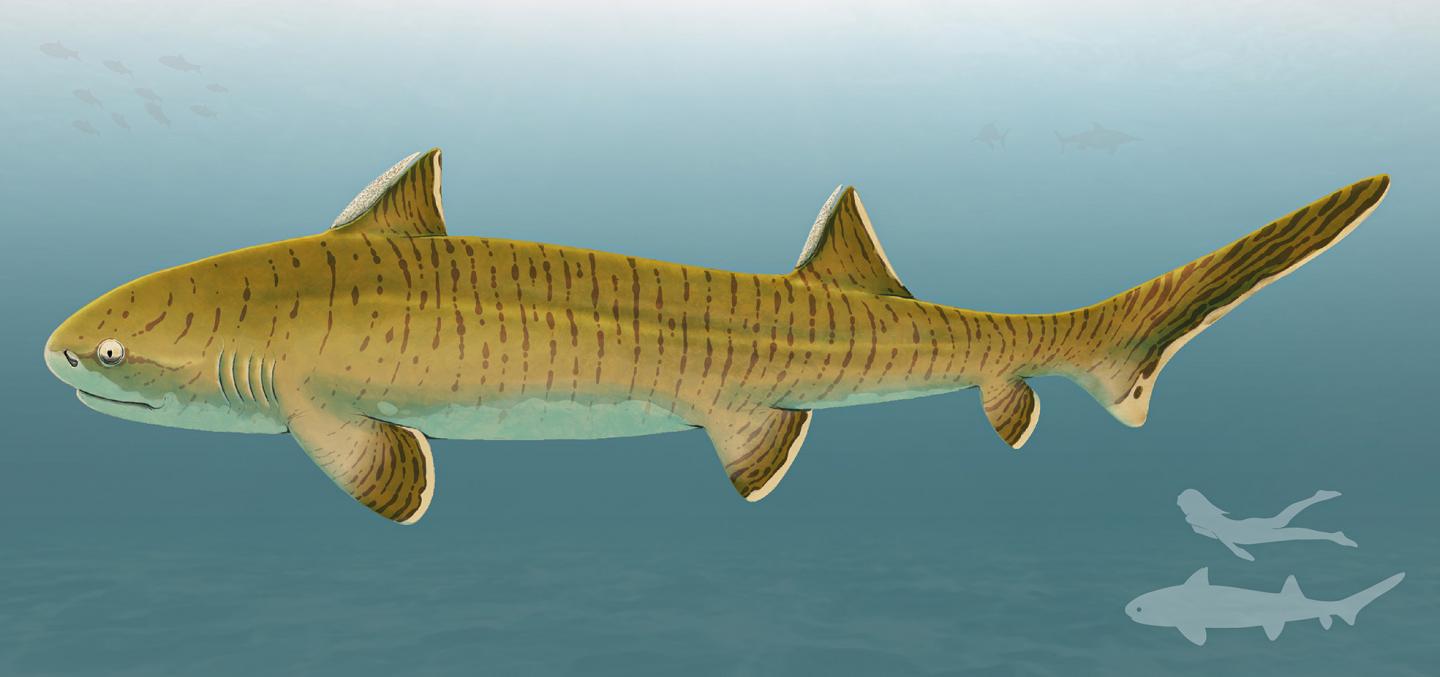 image: Tentative life reconstruction of the hybodontiform shark Asteracanthus; for scale see silhouettes at the right lower corner