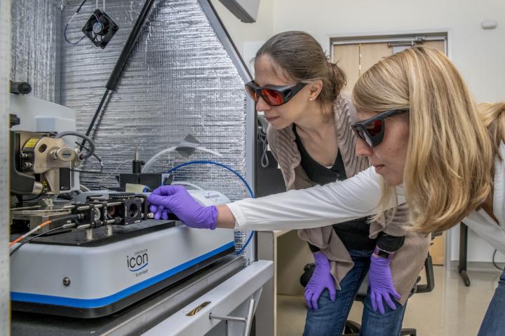 image: Berkeley Lab researchers Francesca Toma (left) and Johanna Eichhorn used a photoconductive atomic force microscope to better understand materials for artificial photosynthesis.