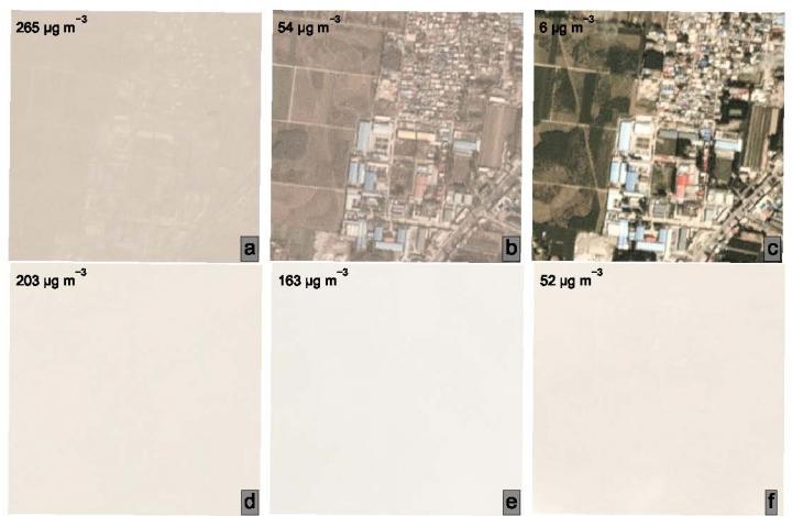 image: Six different photos taken of the same area of Beijing on different days experiencing different levels of air pollution. While the naked human eye can clearly tell that some days are more polluted than others, a new machine learning algorithm can make reasonably accurate estimates air pollution at ground level.