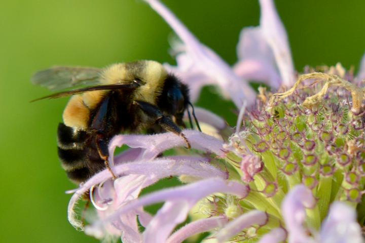 image: The timing of floral resources complicates life for the rusty patched bumble bee, Bombus affinis, a new study finds. This bee is foraging on the flower of the bee balm, of the genus Monarda.