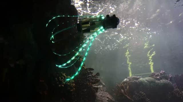 video: ngineers at the University of California San Diego have built a squid-like robot that can swim untethered, propelling itself by generating jets of water. The robot carries its own power source inside its body. It can also carry a sensor, such as a camera, for underwater exploration.