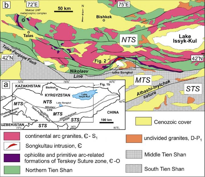 image: (a) Tectonic units of the Tien Shan in Kyrgyzstan; (b) schematic geological map of the Songkultau area