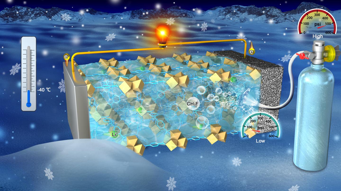 The researchers tested the MOF-based separator in lithium-ion battery cells—built with a carbon fluoride cathode and lithium metal anode—filled with fluoromethane gas electrolyte under an internal pressure of 70 psi, which is well below the pressure needed to liquefy fluoromethane. The cells retained 57% of their room temperature capacity at -40 C. By contrast, cells with a commercial separator exhibited almost no capacity with fluoromethane gas electrolyte at the same temperature and pressure.