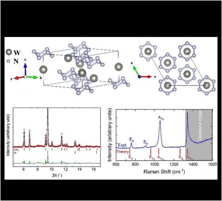 The team created WN6 in a laser-heated diamond anvil cell by elemental reaction between tungsten and nitrogen above pressure of about 1.3 Mbar and temperature of ~3500 K. In-situ synchrotron x-ray diffraction (XRD) allowed them to identify the tungsten hexanitride phase, crystallizing with novel armchair-like N6 rings, and the high-pressure Raman spectroscopy measurement confirmed the presence of N-N single bonds in N6 rings. Further theoretical calculations also support their experimental observations.