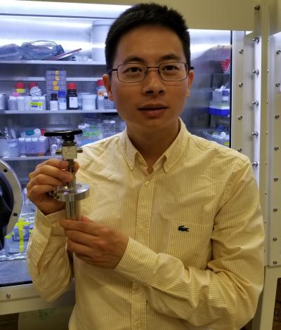 image: Postdoctoral scholar Wei Chen holds a prototype of what could one day be a ginormous battery designed to store solar and wind energy thanks to a water-based chemical reaction developed in the lab of Stanford materials scientist Yi Cui.