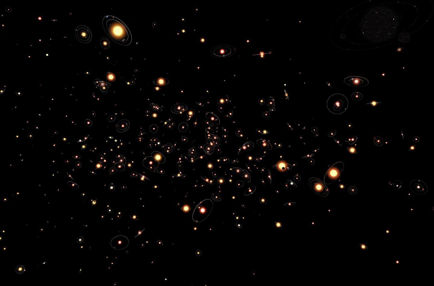 image: This is an artist's impression of planets around stars in the Milky Way. Here, planets and their host stars are much closer together than they are in reality.