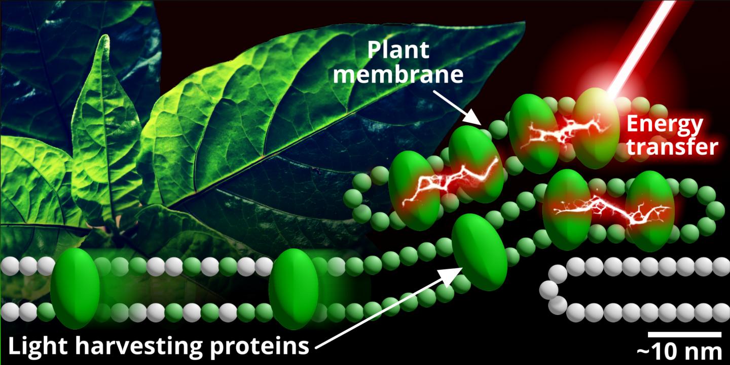 image: Light is absorbed by light-harvesting proteins in the plant membrane. The energy excites the proteins and the way they arrange themselves determines the way energy is transferred through the plant.