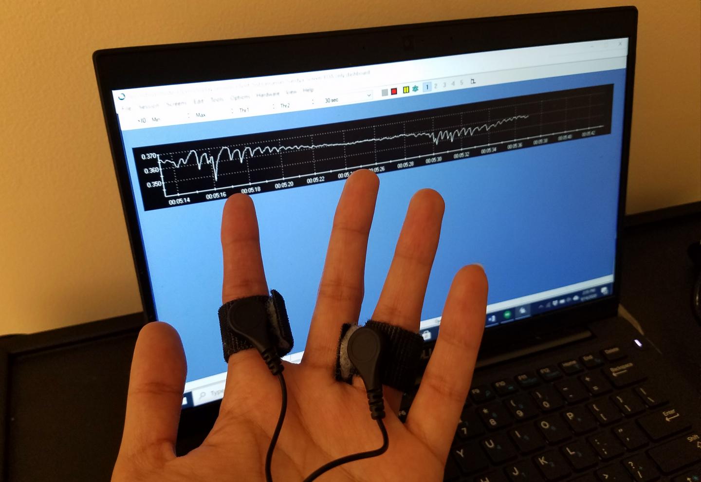 image: With electrodes strapped to two fingers, researchers can read out a signal of electrodermal activity.