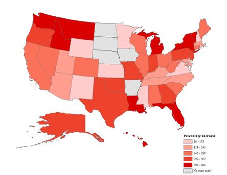 image: This map shows the percentage increase in epidemic doubling time between pre-stay-at-home order and during stay-at-home order time periods, by state.