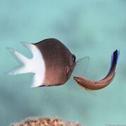 image: A spiny chromis waits patiently as a cleaner wrasse inspects its fins and body for parasites.