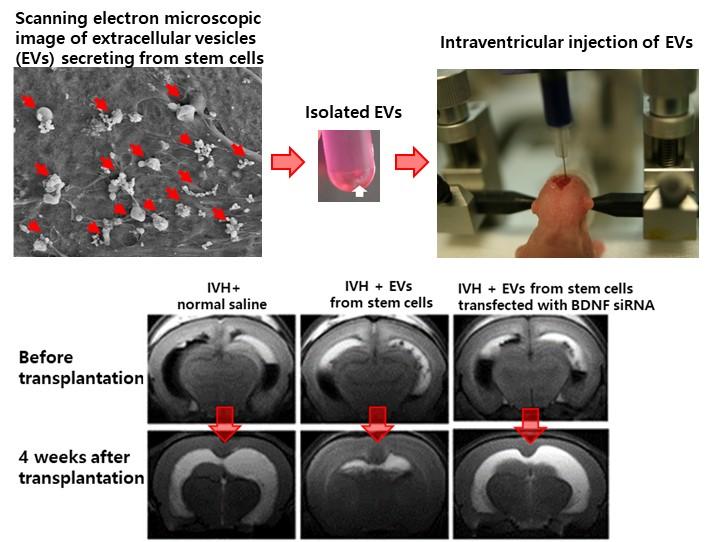 image: Recent reports showed that stem cells transplantation was effective on improving brain injury from severe intraventricular hemorrhage in newborn rats. As a next step, because stem cells secrete bioactive extracellular vesicles, researchers tried to prove the therapeutic effects of EVs as next-generation therapeutic candidates against newborn IVH. Intracerebroventricular transplantation of EVs secreted from stem cells effectively attenuated brain injury from severe IVH via transferring brain-derived neurotrophic factor in newborn rats.