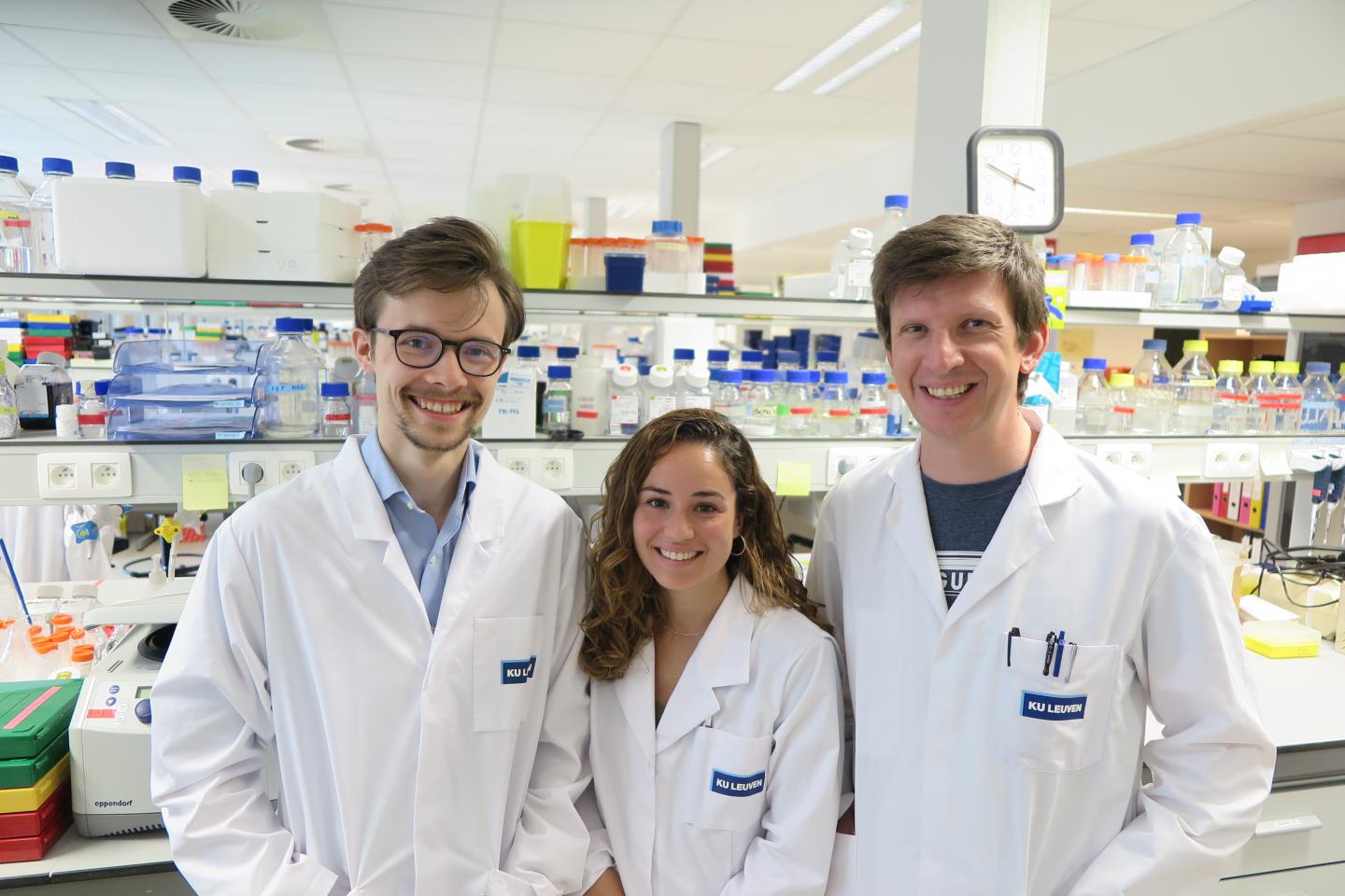 image: "The first step towards developing new treatments is figuring out how X chromosome reactivation actually works." PhD researchers Adrian Janiszewski (left) and Irene Talon (middle) with Assistant Professor Vincent Pasque (right) from KU Leuven.