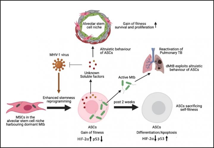 image: Schematic representation of the putative altruistic defense of stem cell niche against murine hepatitis virus-1 (MHV-1) infection in dormant Mycobacterium tuberculosis (dMtb) harboring mice. The viral infection induces enhanced stemness or altruistic stem cell (ASC) reprogramming of lung mesenchymal stem cells (MSCs), which then expands and secretes yet unknown secretory products/vesicles/antimicrobial peptides to enhance the group fitness of the type II alveolar cells present in the alveolar stem cell niche. The proliferating ASCs then undergo spontaneous apoptosis/differentiation by activating p53 upstream genes involved in apoptosis, thus sacrificing self-fitness, similar to embryonic stem cell-derived ASCs. The dMtb exploits this ASC-based stem cell niche defense for the reactivation of pulmonary tuberculosis (TB). HIF, hypoxia-inducible factor.