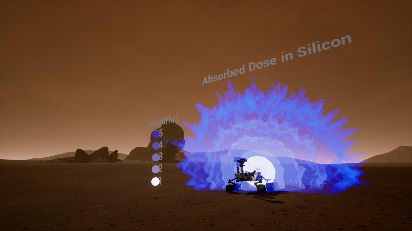 image: The image shows a visualization of a radiation transport simulation for a spaceflight radioisotope power system and complex interactions of radiation fields with operational environments.