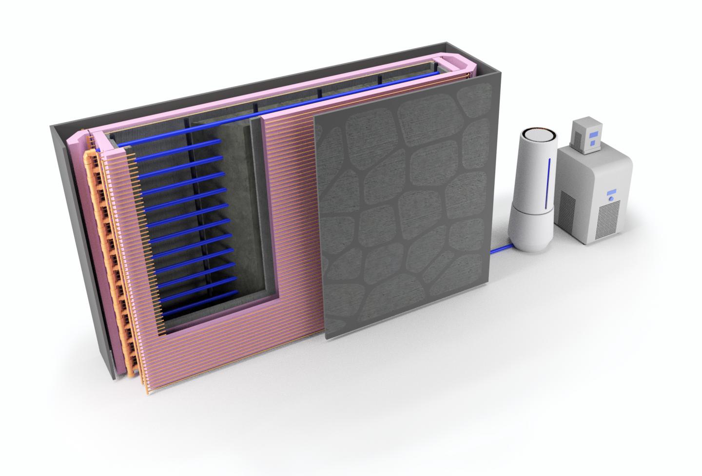 The prototype wall was manufactured with a cable-driven, field deployable concrete additive manufacturing system and embedded with a thermal storage and active insulation system. A chiller connected to the wall pumps cool water through pipes. That coolness is stored in the interior and then transferred throughout the room as needed.