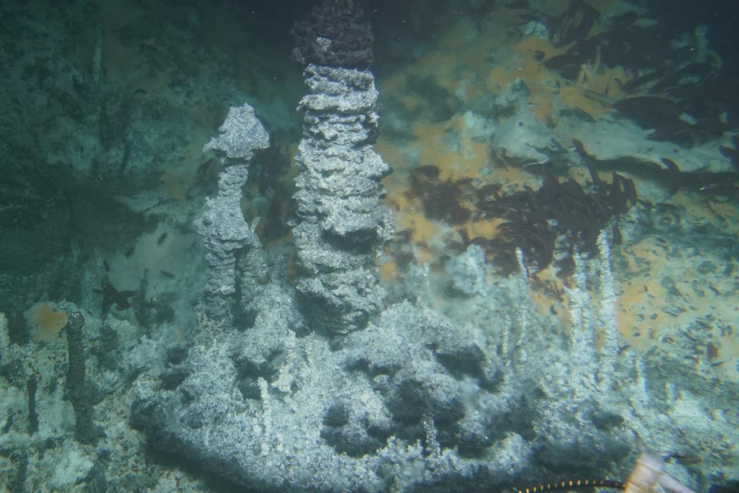 image: The Guaymas Basin hydrothermal vents - the "home" of the studied methane-oxidizing microorganisms. The heat loving microorganisms thrive under the orange microbial mat in the background. The high temperatures of the rising waters blur parts of the image.