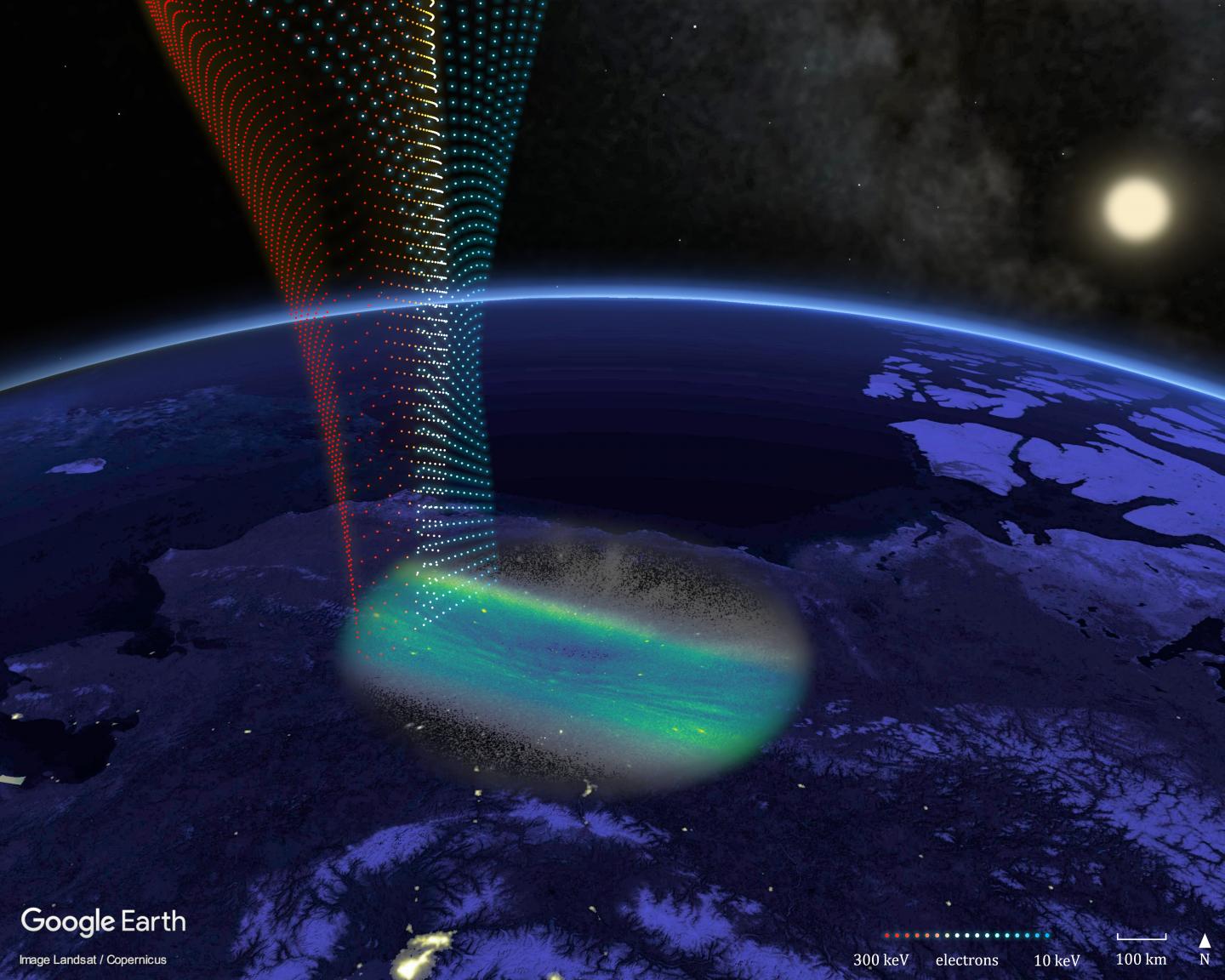 image: This illustration shows the white-light observations of the fine structure in the aurora superimposed over Alaska. The dots signifying electrons are color coded to show their origins, with red dots indicating electrons from the radiation belts and blue from further out.