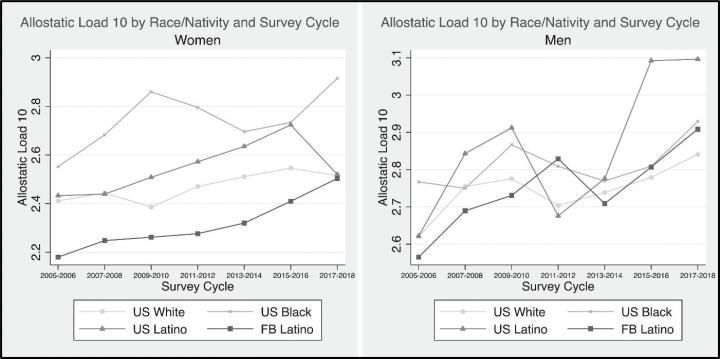 image: These figures show predicted values of allostatic load for women and men for each race/nativity group by survey cycle between 2005 to 2018.
