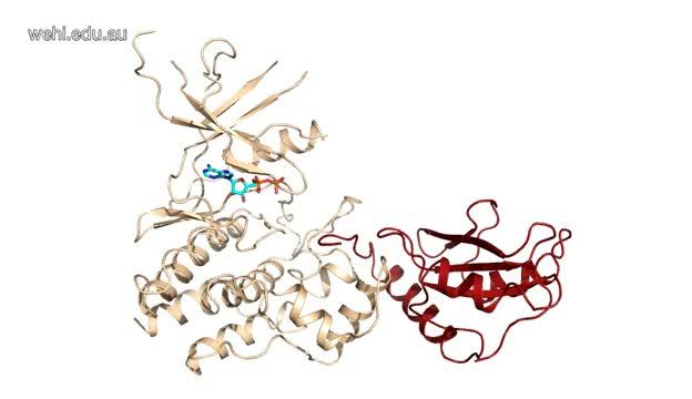 video: The 3D structure of the protein complex of SOCS1 (red) and JAK1 (beige) explains how SOCS1 'swtiches off' signalling and could underpin the development of new cancer treatments.