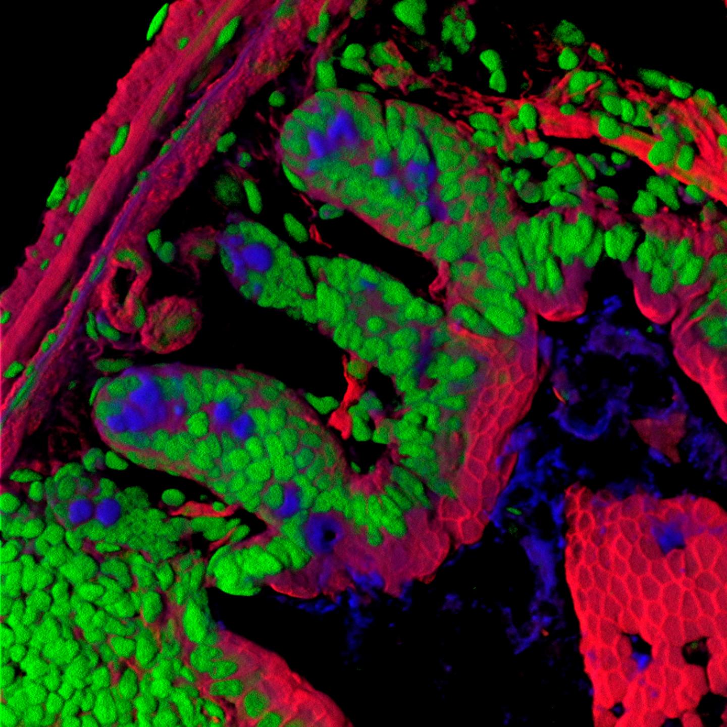 image: Confocal micrograph of a frozen section of mouse gut. Nuclei are shown in green, actin in red and the basement membrane and crypts in blue.