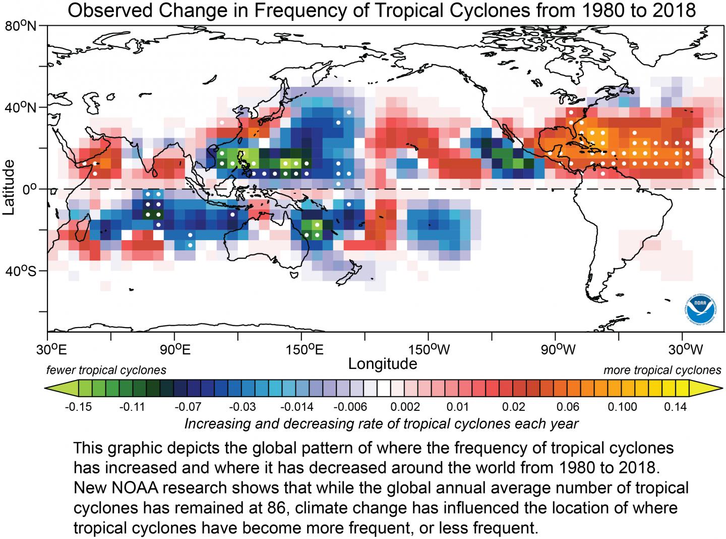 image: This graphic depicts the global pattern of where the frequency of tropical cyclones has increased and where is has decreased from 1980 to 2018. New NOAA research shows that while the annual average number of tropical cyclones has remained at 86, climate change has influenced where the frequency of tropical cyclones have increased, decreased.