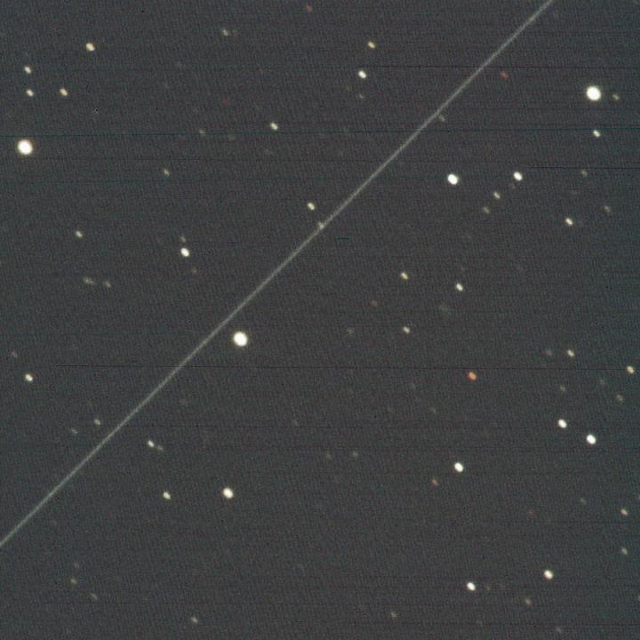 image: The trail of a Starlink satellite (the line from upper right to lower left) captured by the Murikabushi Telescope on April 10, 2020.