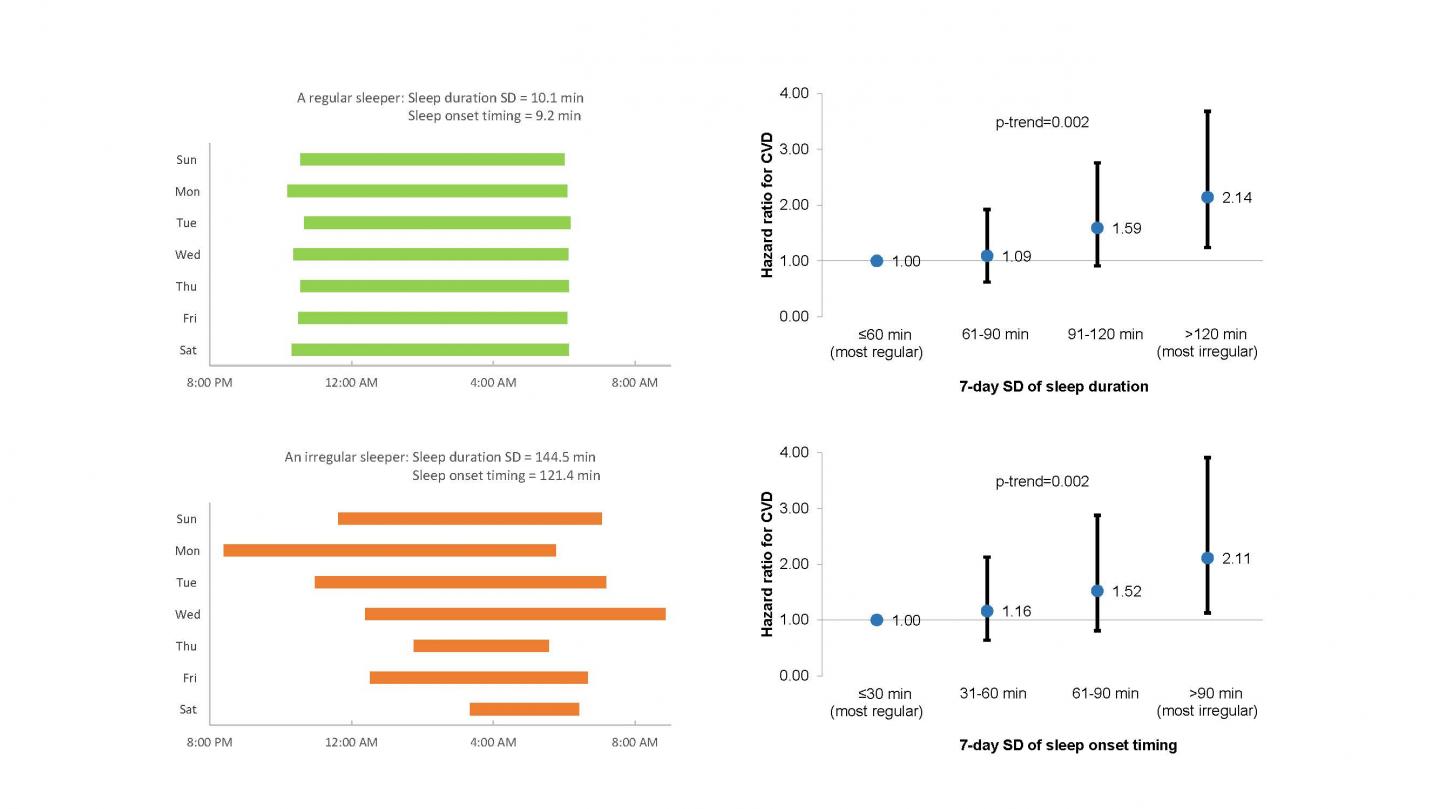 image: The two graphs on the left show 7-day sleep patterns: Highly regular sleepers (graph with green lines) and highly irregular sleepers (graph with orange lines). The colored lines correspond with the graphs on the right showing cardiovascular disease (CVD) risk in regular sleepers versus CVD risk in persons with irregular sleep patterns. Compared with people who have the most regular sleep patterns, study participants with the most irregular sleep patterns had more than twice the risk of developing CVD events over a follow-up period of about five years.
