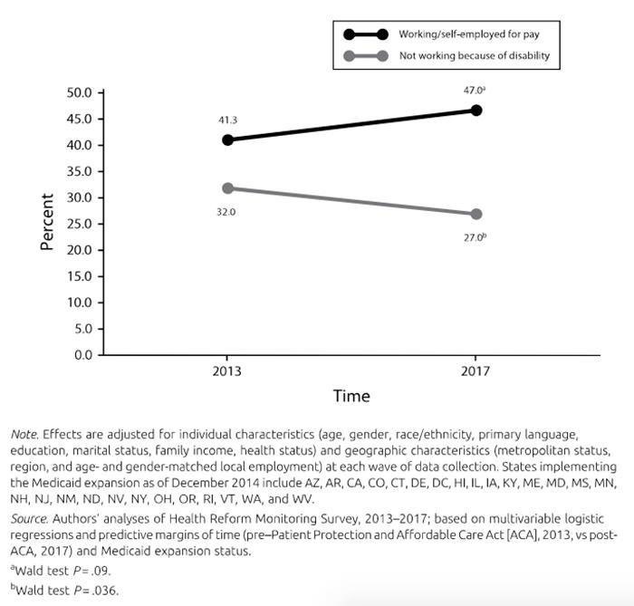 image: This graph shows the percentage of individuals with disabilities in Medicaid expansion states reporting employment and not working because of disability. Employment rates increased, while not working rates decreased in the four years of measurements.