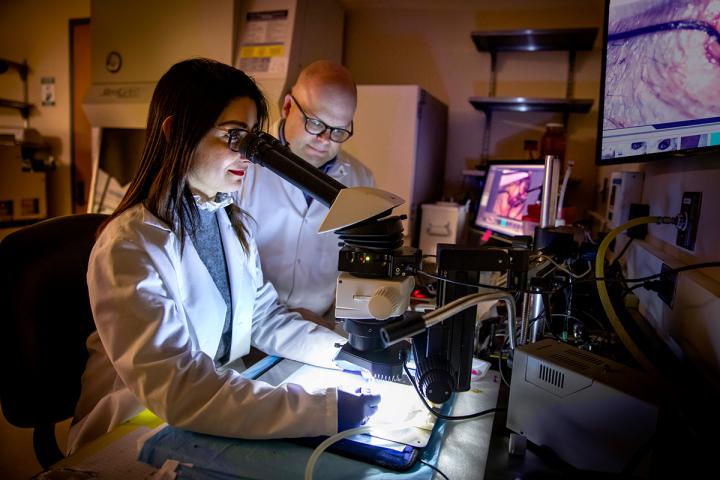 image: Illinois researchers used a suite of imaging methods to create the first holistic picture of peripheral artery disease recovery. Pictured: postdoctoral researcher Jamila Hedhli and professor Wawrzyniec Dobrucki.