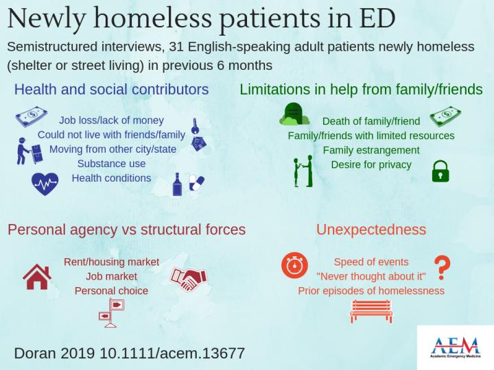 The study is the first to examine pathways to homelessness among ED patients. The findings of the study are discussed in a recent AEM podcast, "It Wasn't Just One Thing": A Qualitative Study of Newly Homeless Emergency Department Patients."