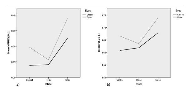 image: Influence of closed eyes over the different states. The influence of closed eyes plays a different role in the different states. Interaction between eyes (blue closed, green open) and state (Control, Relax and Tense) is shown for MFREQ (a) and FD-CE (b). Interaction is shown in relation to the relaxed state.
