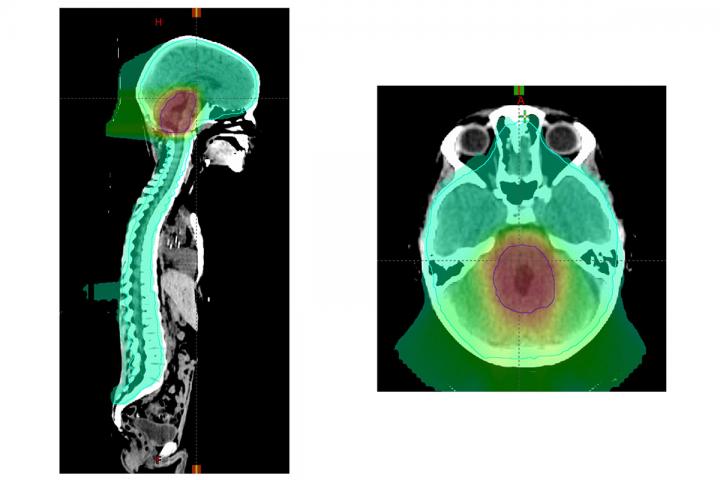 image: A new study led by Washington University School of Medicine in St. Louis provides new guidance on the treatment of medulloblastoma, a pediatric brain cancer. Some aspects of radiation therapy may be reduced while still providing effective treatment. Shown is a proton therapy plan for a patient with medulloblastoma. An extra "boost" radiation dose to the back of the brain is shown in red. The preventive radiation treatment to the entire brain and spine is shown in green.