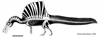 image: Reconstructed skeleton of a moderately sized Spinosaurus showing its famous sail-back and tail plume. Scale bar is 1 m.