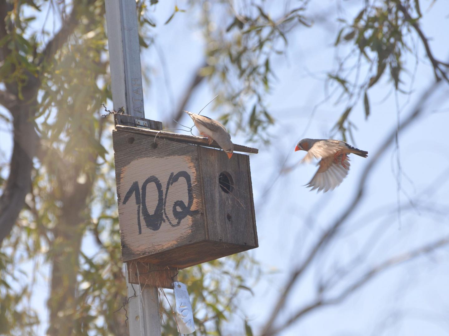 image: A zebra finch pair is inspecting a nest box.