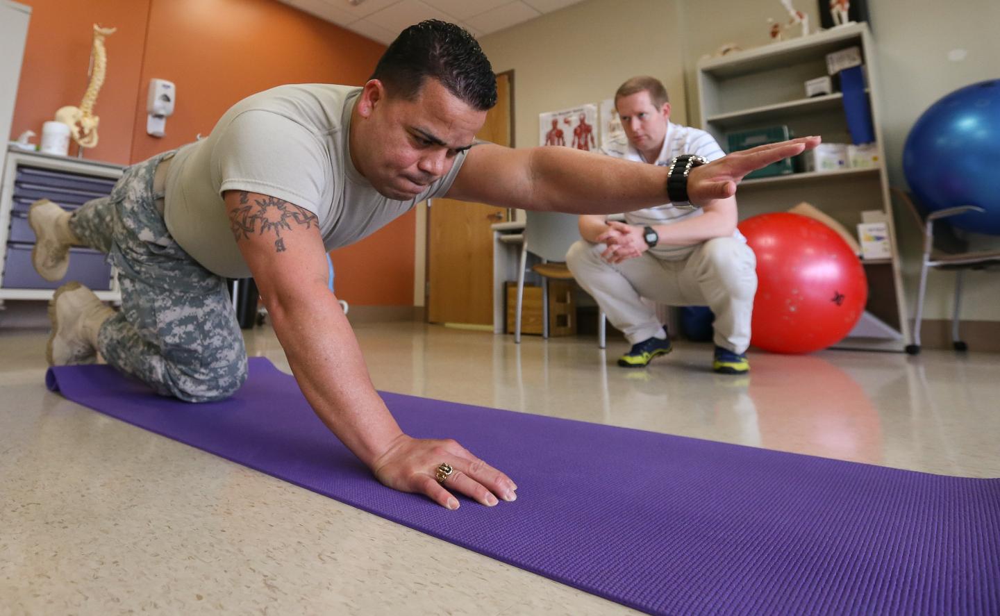 image: Capt. Israel Orengo is evaluated by physical therapist Tyler Snow at Madigan Army Medical Center in 2015. Snow was one of the researchers on an Army study that looked at incorporating alternative methods such as acupuncture and biofeedback into pain management. A new study based on VA records suggests long-term benefits from service members' non-drug pain treatment.