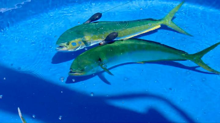 image: Captive spawning Mahi-mahi, or dolphinfish, tagged by the research team located at the UM Experimental Hatchery were used to build predictive spawning models.