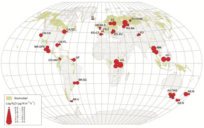 image: These are the studied areas and their average measured laughing gas emission on the map of the world's organic soils.