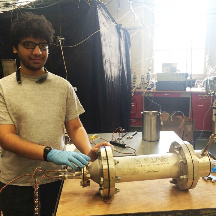 image: Rishabh Shah and his 'oxidative flow reactor,' which speeds up atmospheric processing to quickly capture air's full potential to form secondary particles.