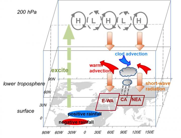 "The AMO-related tropical diabatic heating anomaly excites the Silk Road wave-train over Eurasia with positive geopotential height and anticyclonic circulation anomalies over Europe-West Asia and Northeast Asia, but negative geopotential height and cyclonic circulation over Central Asia. Such opposite circulations lead to opposite changes in temperature advection, precipitation, cloud cover and solar radiation. When these effects overlap the signals of global warming, it causes ampli?ed warming," the authors explain.