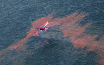 image: An aircraft applies dispersants to a slick of sunlight-weathered oil in the Gulf of Mexico in 2010.