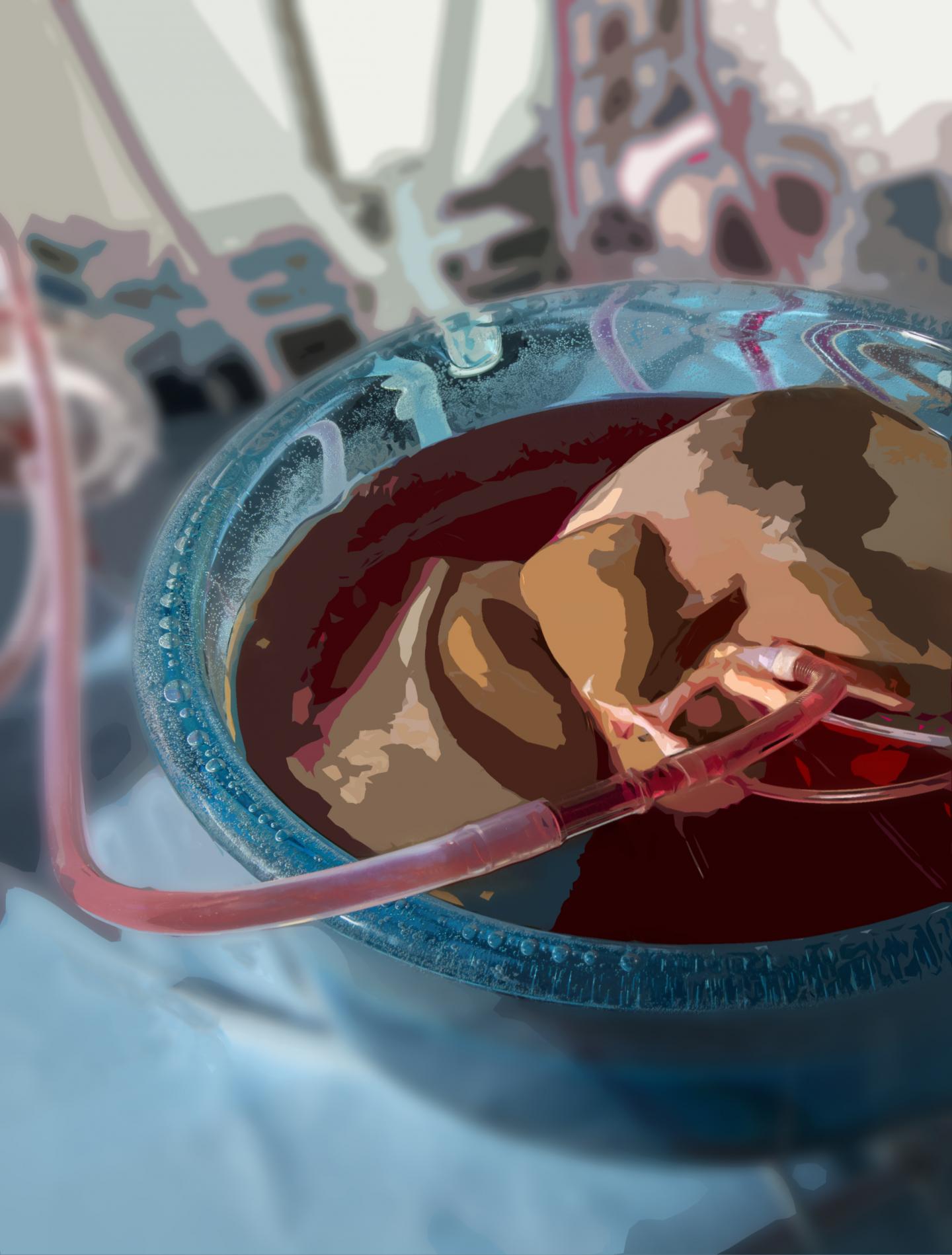 image: This is a stylized photo of a human liver during machine perfusion while it is being preconditioned with protective agents for supercooled storage.
