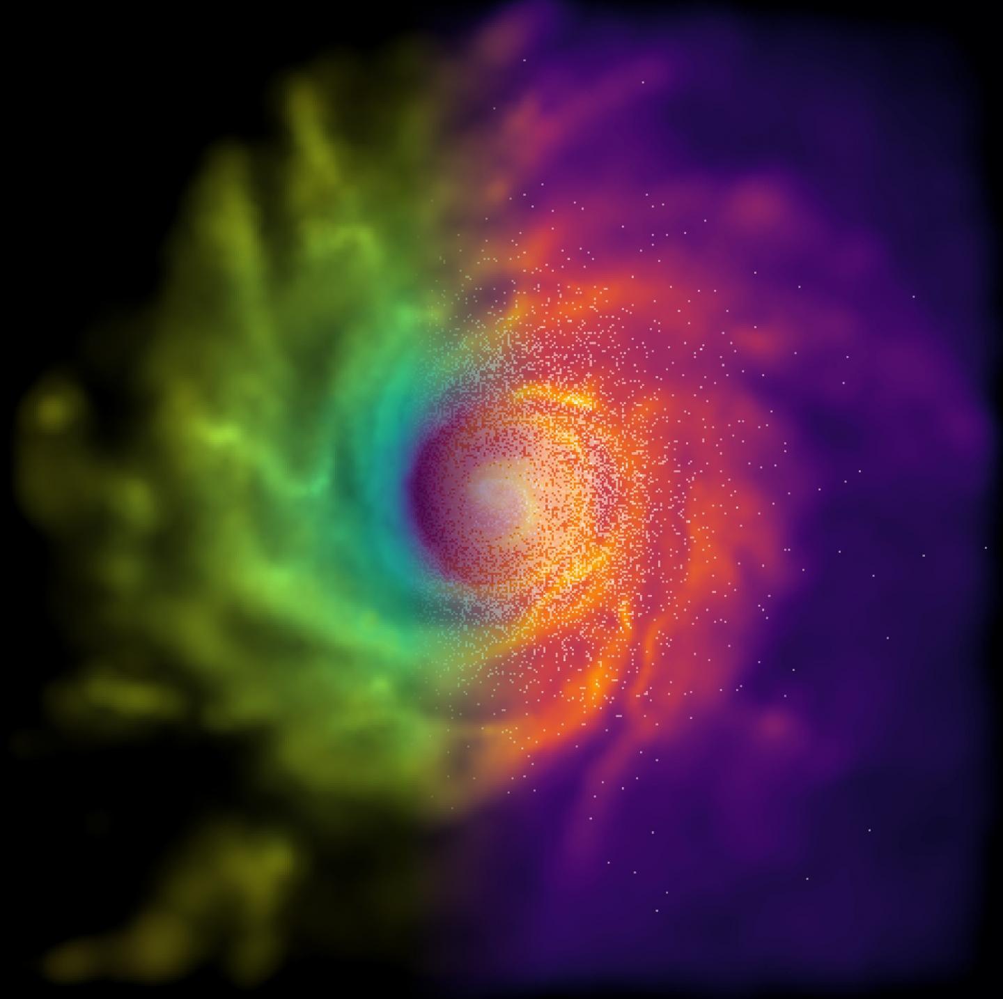 image: Computer generated images showing a disk galaxy from a modified gravity simulation.