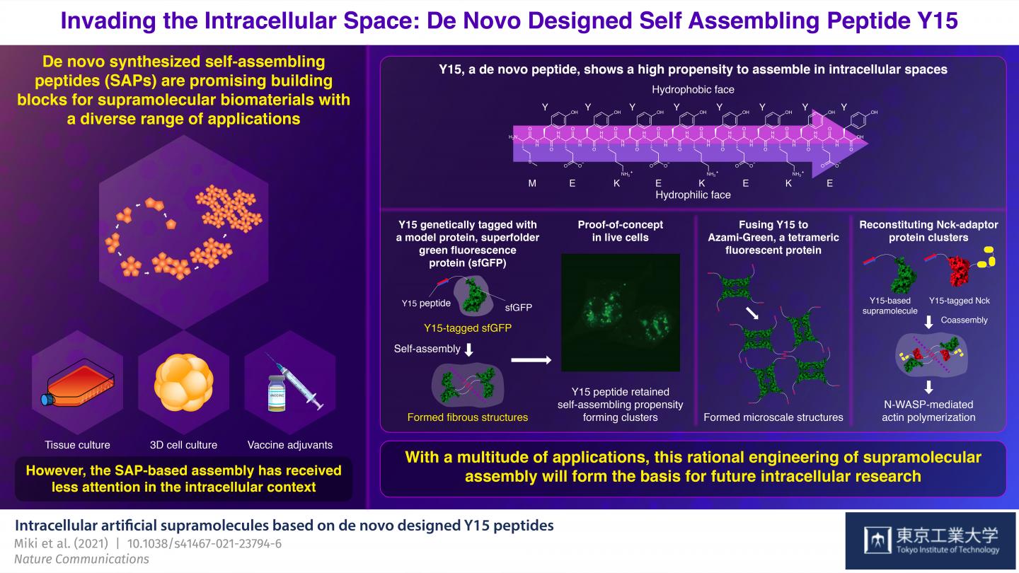 Fortunately, a team of scientists from the Tokyo Institute of Technology (Tokyo Tech), led by Assistant Prof. Takayuki Miki, have reported a de novo peptide, Y15, that readily forms secondary structures to enable bottom-up synthesis of functional protein assemblies in live cells. Their findings are published in Nature Communications. Assistant Prof. Miki explains, "The cell environment is a dense milieu in which macromolecules occupy a considerable volume; developing SAPs that interact in such a crude setting is difficult. Thankfully, we were able to create a de novo peptide--that is, from scratch--which shows a high propensity to assemble in intracellular spaces."