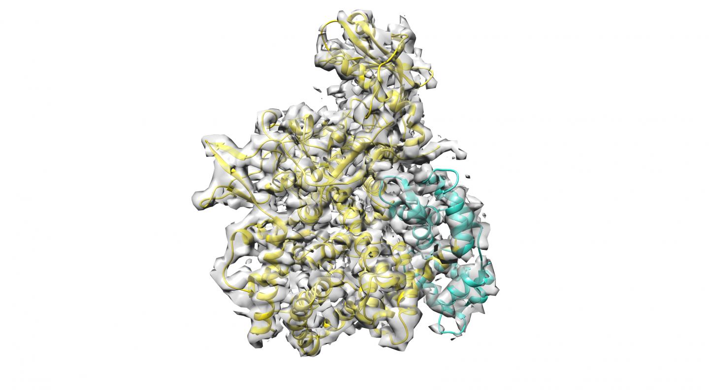 image: Cryo-Electron microscopy structure of SidJ (yellow)-calmodulin (cyan) complex with the experimental cryo-EM map shown in grey.