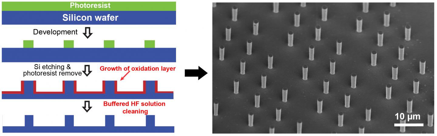 image: The production process for strong, deformable silicon pillars (links). The pillars are first etched through a resist, then oxidized and finally cleaned. On the right, the end result can be seen (electron microscope image).