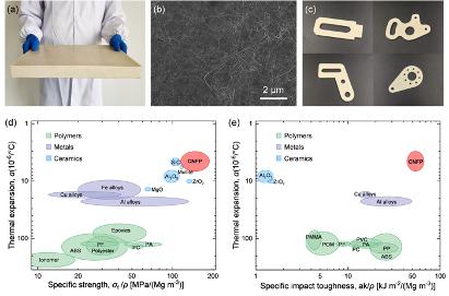 image: The cellulose nanofiber-derived bulk CNFP structural material and its characterization. (a) Photograph of large-sized CNFP with a volume of 320 × 220 × 27 mm3. (b) The robust 3D nanofiber network of CNFP. Numerous CNFs are intertwined with each other and combined together by hydrogen bonds. (c) Parts with different shapes of CNFP produced by a milling machine. (d) Ashby diagram of thermal expansion versus specific strength for CNFP compared with typical polymers, metals, and ceramics. (e) Ashby diagram of thermal expansion versus specific impact toughness for CNFP compared with typical polymers, metals, and ceramics. Copyright 2020, American Association for the Advancement of Science.